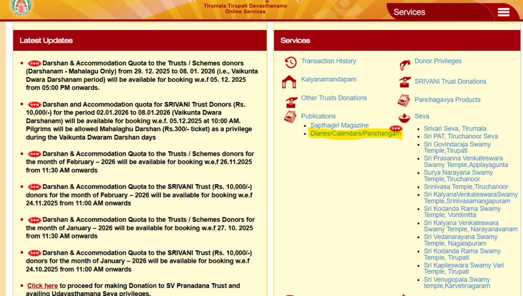 - TTD Calendar or Diary can be booked directly from TTD Website – https://tirupatibalaji.ap.gov.in/#/userLogin